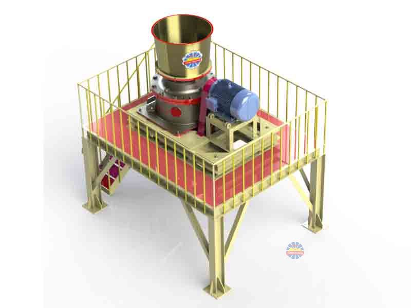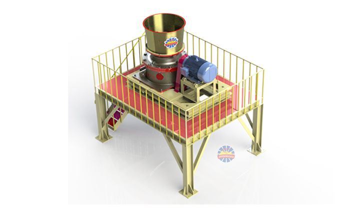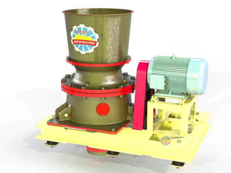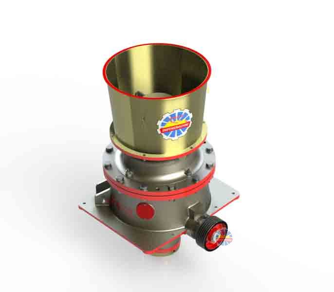 PYY圓錐破碎機工作時:電機帶動破碎機的小齒輪,小齒輪帶動大齒輪,大齒輪組件(大齒輪、大齒輪架、偏心鋼套)帶動偏心套組件(偏心缸套、偏心銅套)和主軸組件(主軸、內錐、內錐襯板)以理論垂直線為中心,在銅襯套內公轉,主軸組件在偏心銅套內以主軸的中心線可以實現自轉。空機運行的時候,偏心套組件“抱著”主軸組件和隨大齒輪一同公轉,當物料加入到破碎腔后,主軸總成(主軸、內錐)在物料的阻力下在偏心銅套內緩慢的自轉。內錐的運行軌跡看起來是在破碎腔內來回擺動,同時緩慢的旋轉。物料被擺動的內錐擠壓破碎。支撐套與架體連接處靠液壓缸壓緊,當破碎機內落入金屬塊等不可破碎物體時,單缸的動錐由底部液壓活塞托起,起到排放口調整和過鐵保護、反復起落排除堵礦的作用。